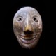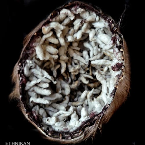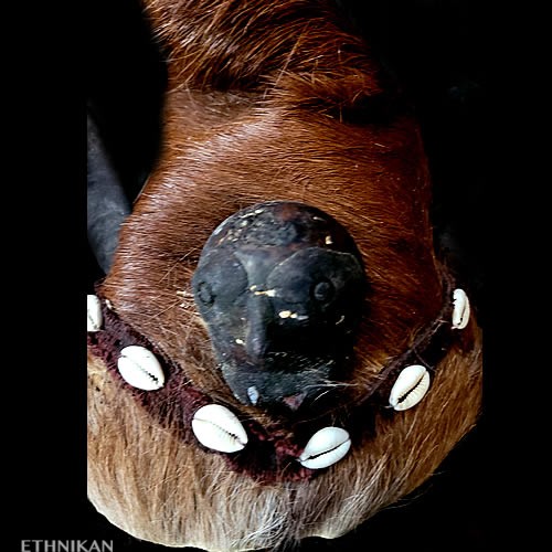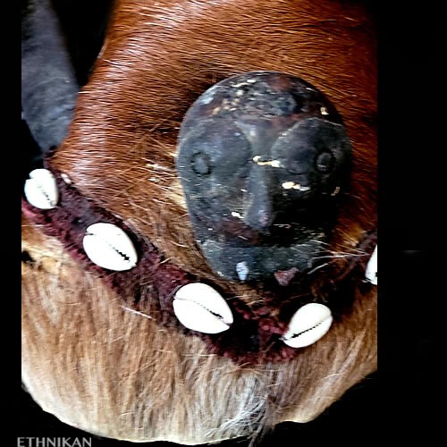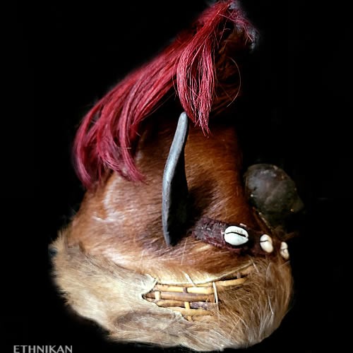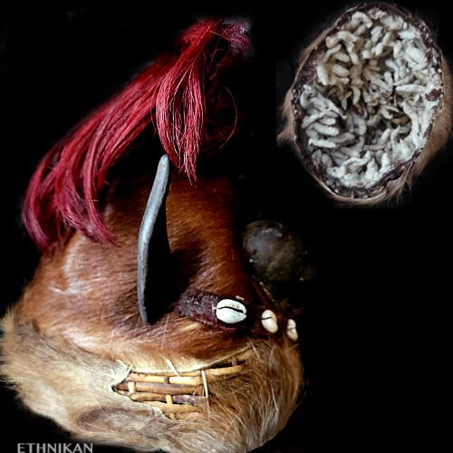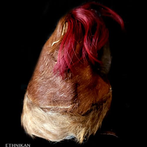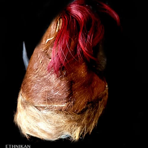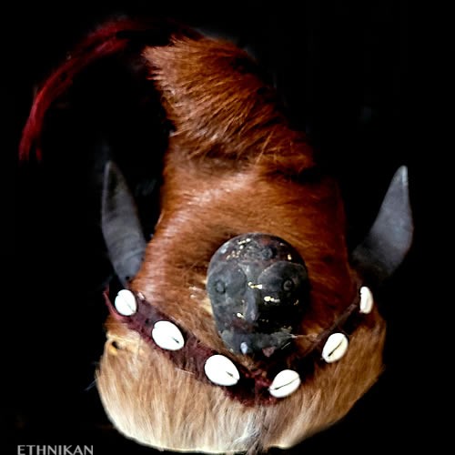 Cornes de chèvre, poils de chèvre teintés rouges, fourrure et peau d’ours, base du casque en paille tressée, doublure en coton garni balles de coton, cauris, coton